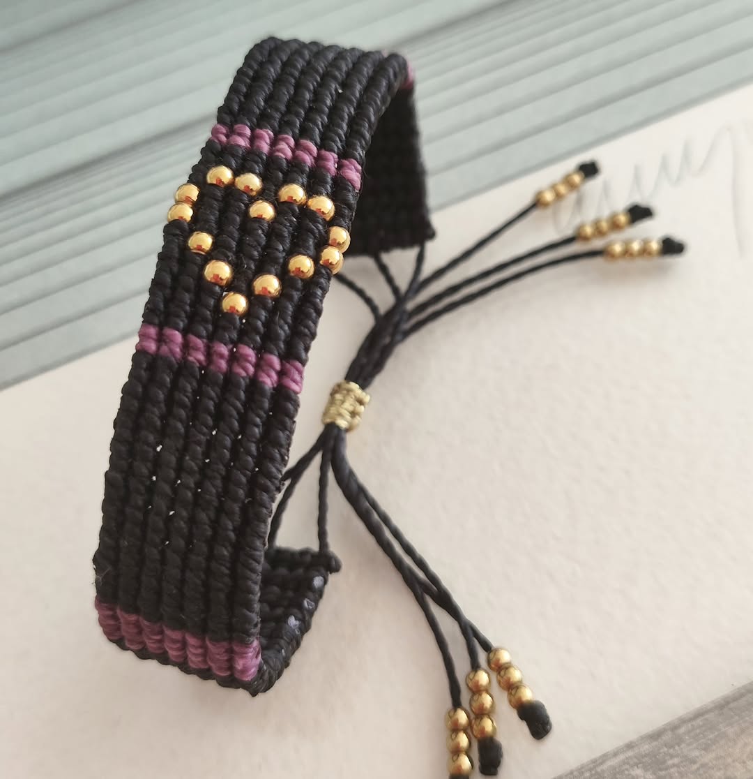 Meticulously handcrafted by Jenny , knot by knot, using fine quality and highly durable macrame cord and stainless steel beads in a gold finish. This bracelet will hold it’s colour and shine for years to come.